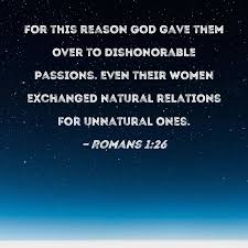 Romans 1 vs 26 For this cause God gave them up unto vile affections: for even their women did change the natural use into that which is against nature: